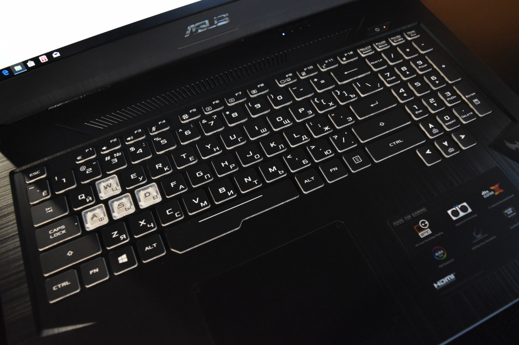 Среди устройств ввода лэптопа есть стандартный тачпад с имитацией нажатий на кнопки, а также мембранная клавиатура с трехуровневой RGB-подсветкой под стать всем трендовым игровым клавиатурам современности. Встроенная в данную модель ноутбука клавиатура имеет ход 1.8 мм, а клавиши WASD отличаются по материалу кейкапов от остальных. По всей видимости, ASUS TUF FX705GM-EW228T ориентирован для поклонников шутеров. Ресурс нажатий клавиш составляет 20 миллионов, ну а RGB-подсветка настраивается с помощью фирменного софта TUF Aura Core.