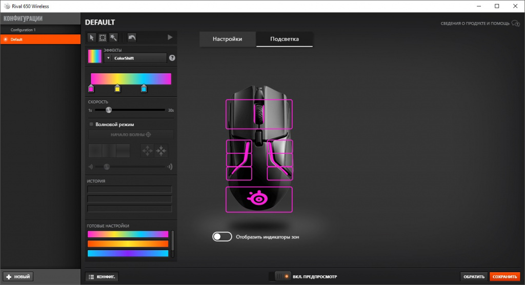 Rival 650 – мышь не симметричная, поэтому ею могут пользоваться только правши. Соответственно и дополнительные кнопки находятся с левой стороны. Всего их четыре, одна из которых располагается на «спине» мышки, она отвечает за изменение dpi, а три остальных находятся на левой боковине. Две кнопки «из коробки» выполняют функции «вперед-назад» в браузере и в операционной системе, а третья кнопка достаточно труднодоступна, но может быть подходящей для ситуационного использования в играх. К слову, все кнопки, полностью настраиваются через фирменный софт, впрочем, как и восьмизонная RGB-подсветка. Rival 650 имеет непривычно много подсветки на корпусе. К тому же, большая часть освещения перекрывается рукой во время работы, но подсветка действительно очень крутая и стильная. Думаем, что с этим спорить будет достаточно сложно.